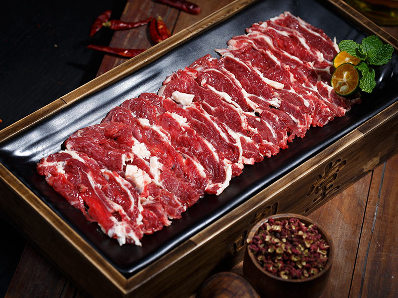 吊龙是牛身上脂肪最少的只有4%的牛里脊,其肉质鲜滑精道,有一种独特的嚼劲。